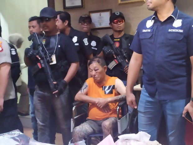 Akang yang dihadirkan ke depan awak media tampak duduk di atas kursi roda. Betis kanannya dibalut perban putih
