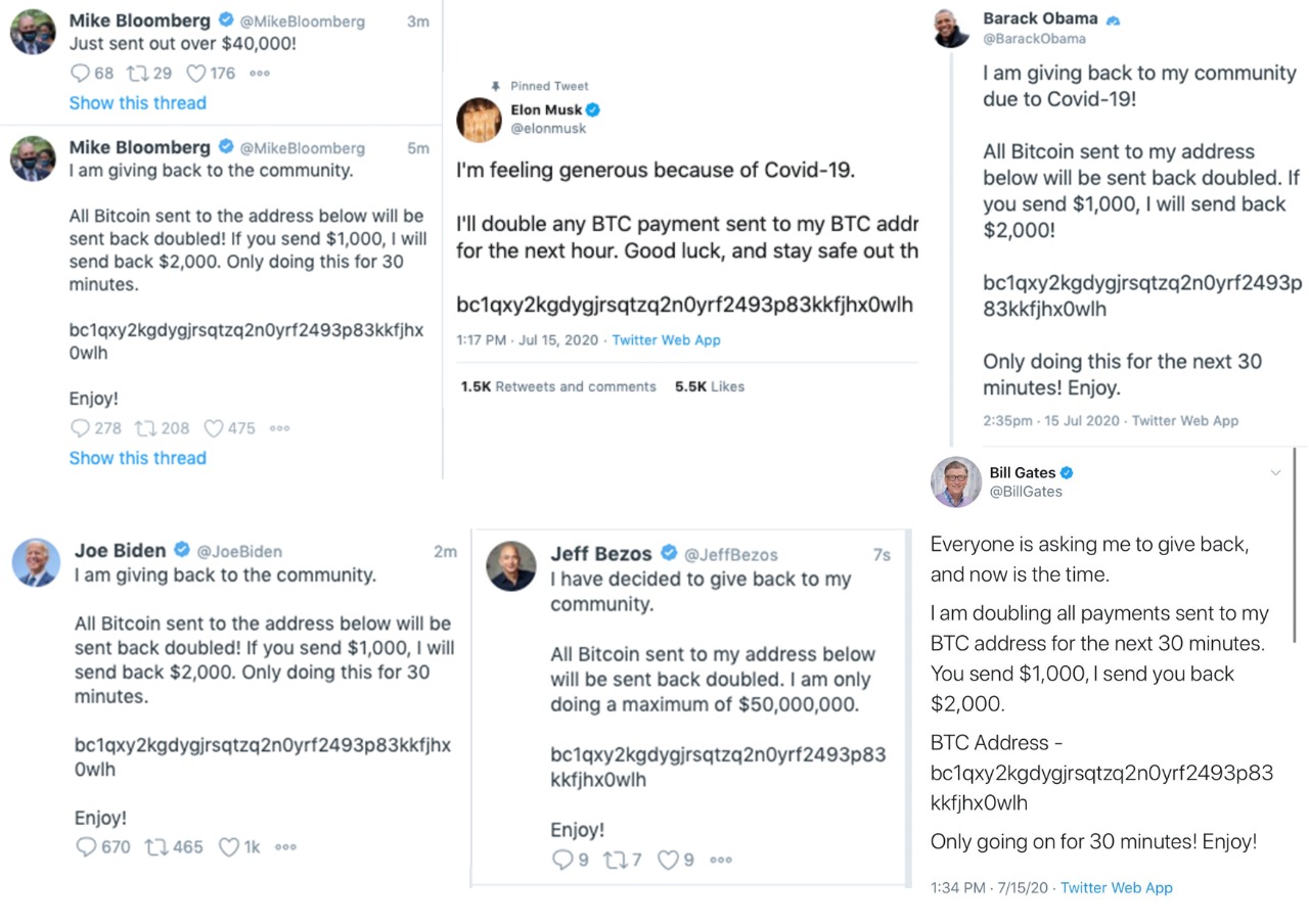 Publik netizen seluruh dunia khususnya Twitter dibuat terkejut saat akun ternama seperti Bill Gates, Barrack Obama, Jeff Bezos dan Elon Musk melalui akun twitter mereka melakukan twit yang kurang lebih sama. Semuanya mentwit untuk mengirimkan sejumlah nominal bitcoin dan berjanji akan mengirimkan balik dua kali lipat.