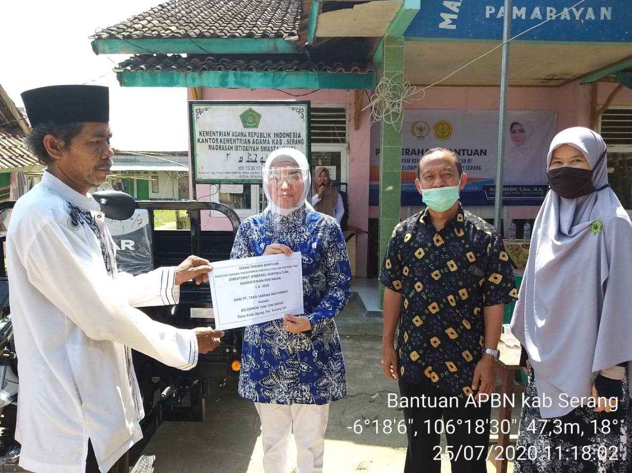 Bantuan diberikan berupa masing-masing 1 unit motor roda tiga kepada Kelompok tani Harapan Mulya (Desa Kebon Cau, Kecamatan Pamarayan) dan Tani Mekar (Desa Kadu Agung, Kecamatan Gunung Sari).