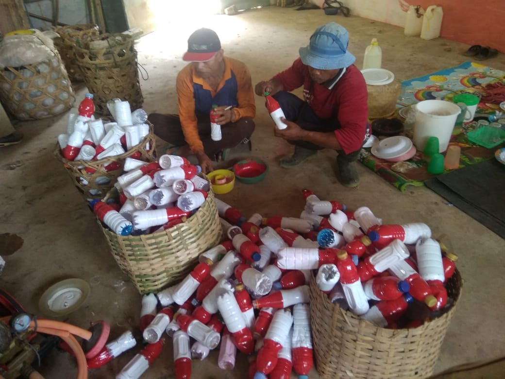 Mereka memasang perangkap lalat buah beratraktan dari botol bekas air mineral yang dicat merah-putih.