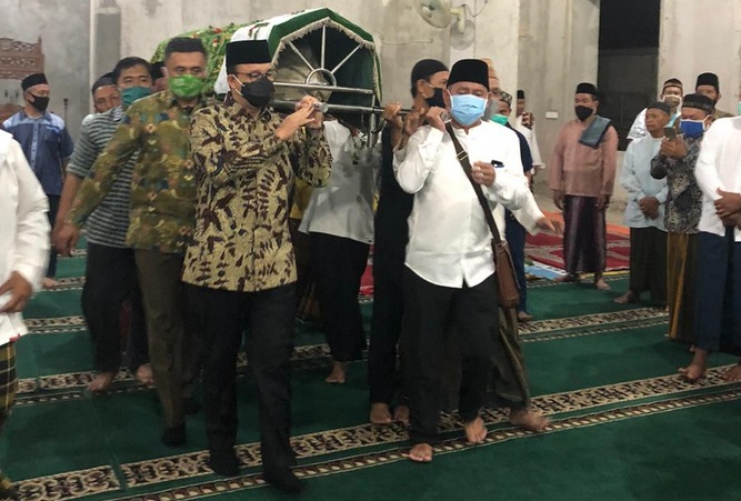 Jenazah dibawa ke Masjid Darussalam Ciledug Tangerang, untuk dilakukan salat jenazah bada salat Magrib oleh jemaah dan rombongan Gubernur Anies. Dalam kesempatan itu, Anies sempat membawa keranda jenazah.