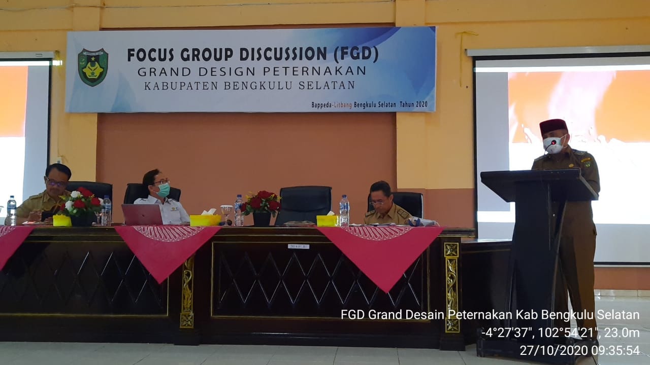 Dalam rangka pengembangan peternakan di Kabupaten Bengkulu Selatan dengan memadukan inovasi teknologi dan inovasi kelembagaan dalam suatu kawasan pengembangan komoditas peternakan, Badan Perencanaan Pembangunan Daerah Penelitian dan Pengembangan (Bappeda Litbang) Kabupaten Bengkulu Selatan memyelenggarakan Focus Group Discussion (FGD) Grand Desain Pengembangan Peternakan Kabupaten Bengkulu Selatan, Selasa (27/10/2020).