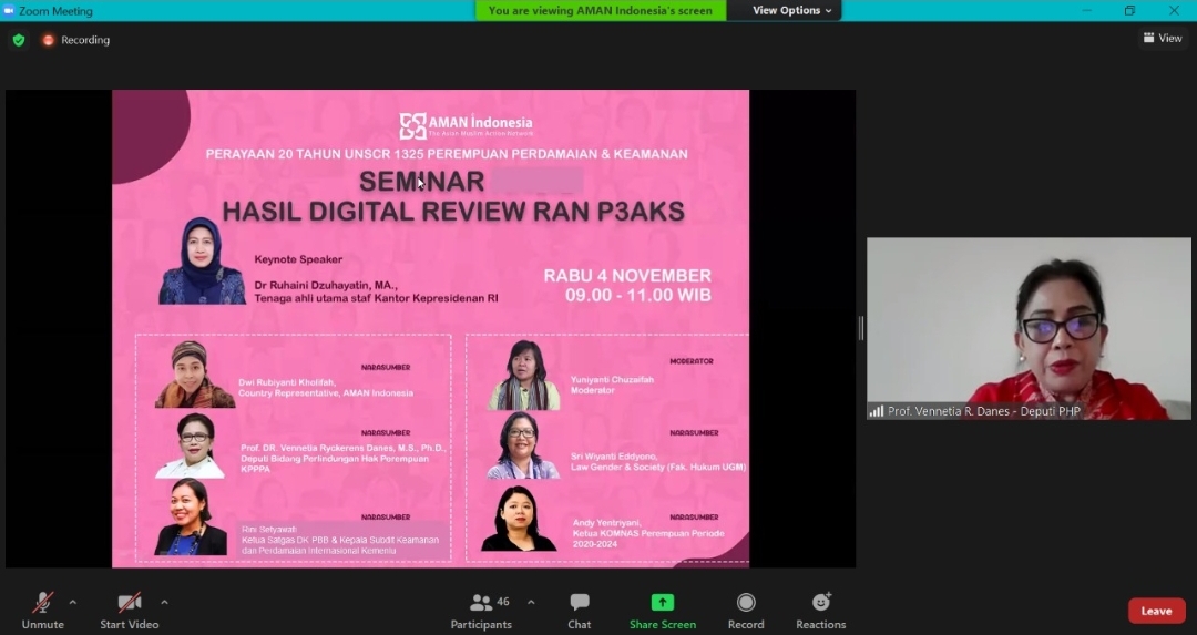 Berdasarkan hal tersebut, maka sangat tepat Indonesia telah memiliki instrumen RAN P3AKS. RAN P3AKS merupakan wujud kemauan politik pemerintah dan rakyat Indonesia dalam rangka mencegah berkembangnya eskalasi kekerasan berbasis gender pada berbagai wilayah konflik di masa mendatang,” ujar Deputi Bidang Perlindungan Hak Perempuan Kementerian Pemberdayaan Perempuan dan Perlindungan Anak (Kemen PPPA), Vennetia R Danes pada Webinar Perayaan 20 Tahun United Nations Security Council Resolution (UNSCR) 1325, Perempuan Perdamaian dan Keamanan yang diselenggarakan oleh The Asian Muslim Action Network (AMAN) Indonesia secara virtual (4/11).