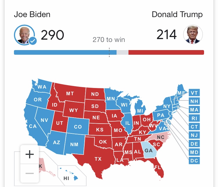 Dengan tambahan 26 electoral votes dari dua negara bagian itu, maka Biden telah meraup 290 electoral votes sedangkan pesaingnya, Donald Trump baru meraup 214 electoral votes.
