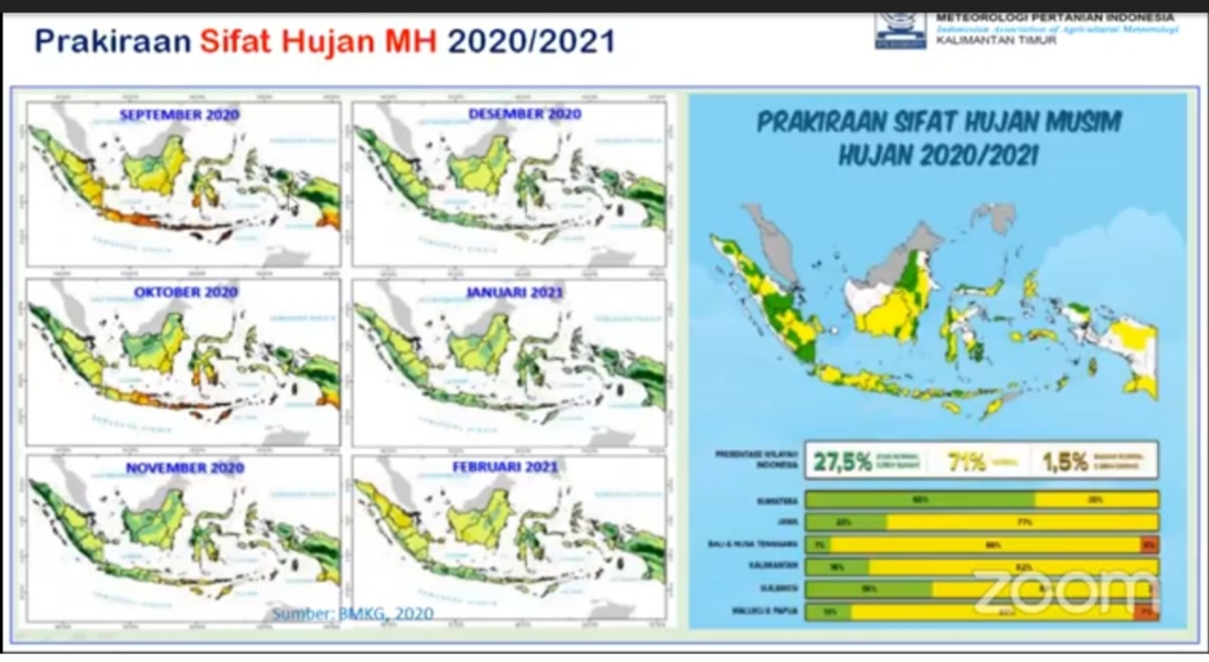 Kepala Stasiun Meteorologi Samarinda, Riza Arian Noor mengatakan secara umum hampir 80% dari zona musim wilayah Kaltim sudah memasuki musim hujan, dengan puncak musim hujan diprediksi terjadi pada bulan Desember 2020 dan Januari 2021.