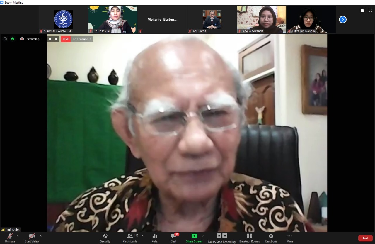 Prof. Emil Salim yang juga merupakan senior ekonomi sangat mengapresiasi kegiatan Summer Course 2020 yang diselenggarakan oleh Departemen ESL dengan tema dan pembahasan yang sangat penting. Emil mengatakan, dunia termasuk Indonesia sedang menghadapi masalah perubahan iklim termasuk polusi, jejak karbon yang sangat membahayakan bagi hidup kita.