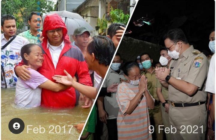 “Foto pertama adalah ketika pertama kali bertemu dengan Ibu Rumiati, warga RW 04 Cipinang Melayu pada masa kampanye 2017. Bahagia sekali tadi malam dapat berjumpa kembali dengan beliau dalam keadaan sehat dan tidak berbasah-basahan,” ujar Anies di akun Instagram pribadinya, @aniesbaswedan, Rabu, 10 Februari 2021.