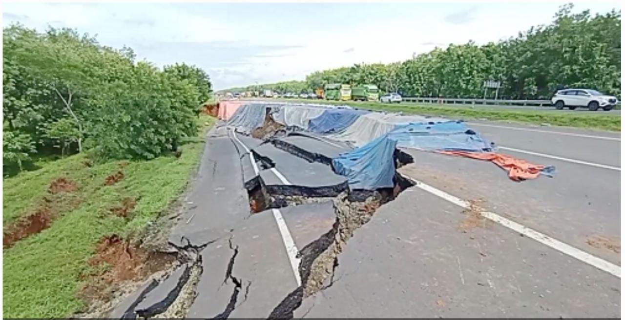 Tingginya curah hujan membuat jalur tol Cipali kilometer 122 mengalami amblas pada Selasa (9/2/2021) dini hari kemarin. Tanah sepanjang kurang lebih 50 meter di lokasi itu amblas sedalam 2 meter, dan hampir menghabiskan satu ruas jalan ke arah jakarta.