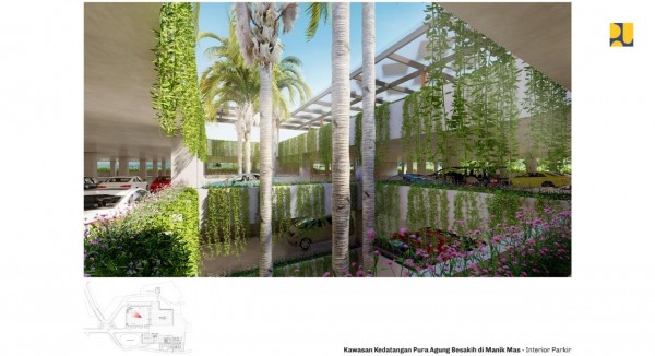 Gedung parkir ini dibangun bertingkat ke bawah terdiri dari 4 lantai dengan luas total 55.201m2. Sesuai rencana, gedung parkir ini akan menampung 1.369 mobil, 61 bus sedang dan 5 bus besar. Gedung parkir ini diharapkan dapat mengatasi permasalahan yang muncul pada saat upacara peribadatan atau pada masa puncak kedatangan wisatawan yang berdampak pada kemacetan akibat banyaknya kendaraan umum maupun pribadi yang datang. Kemacetan yang terjadi pada lokasi eksisting untuk menuju atau meninggalkan kawasan Pura Besakih dapat mencapai puluhan kilometer.