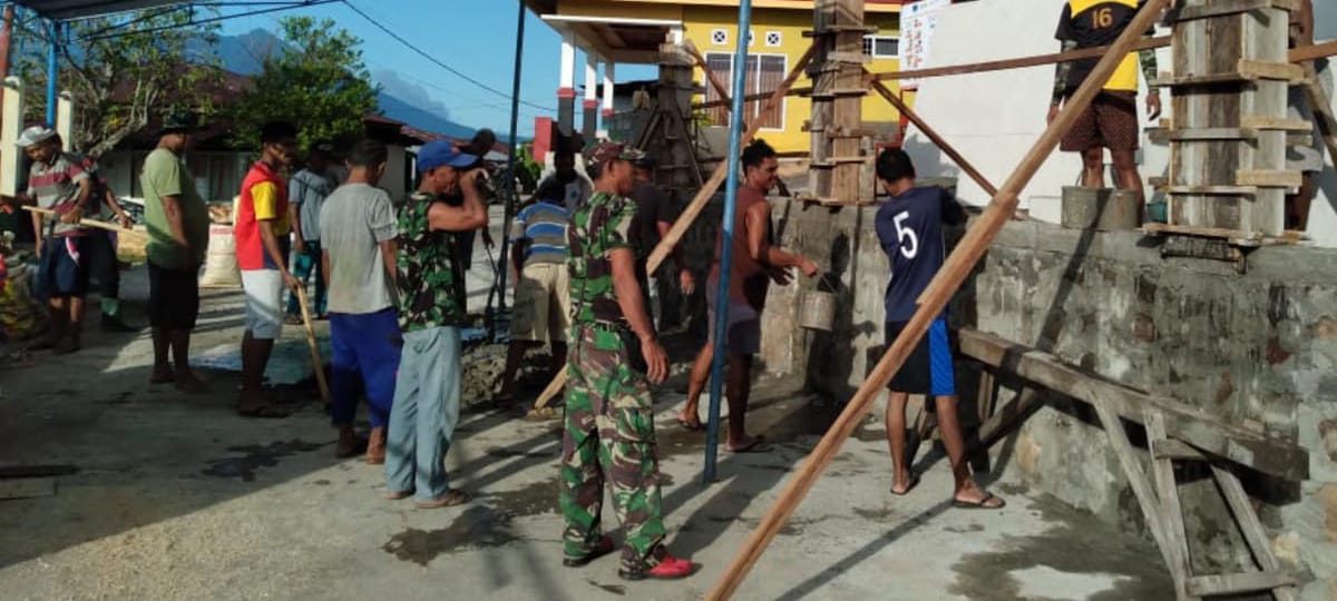 Ternate – Sebelum dibukanya TMMD ke 111 Kodim 1501/Ternate di Kecamatan Pulau Moti Kota Ternate, Babinsa Koramil 02/P. Hiri bersama warga masyarakat bergotong royong, hingga H + 11 saat ini pada tahap melanjutkan pembuatan fondasi dan pemasangan tiang besi dan slop pagar Masjid serta melanjutkan fondasi jalan