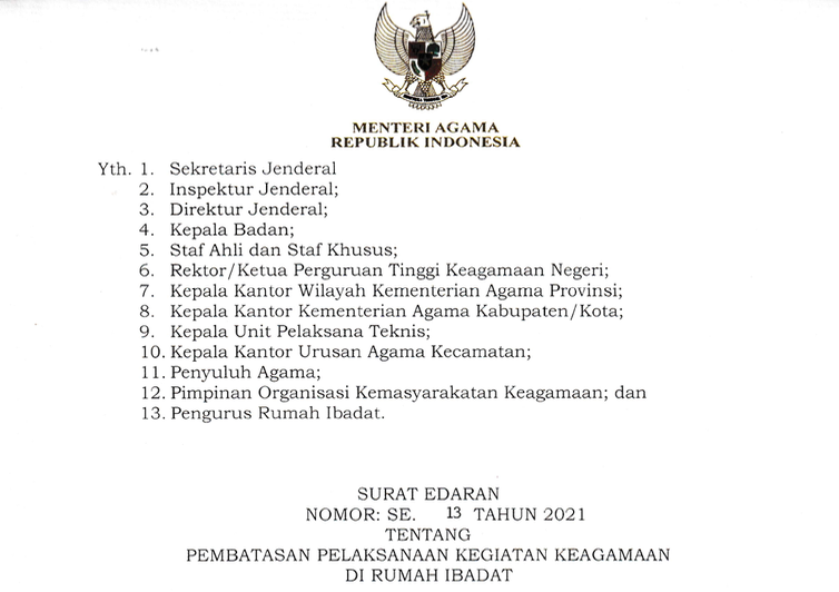 Melalui Surat Edaran (SE) Nomor 13 Tahun 2021 tentang Pembatasan Pelaksanaan Kegiatan Keagamaan di Rumah Ibadah itu, Menag berharap umat beragama tetap bisa menjalankan aktivitas ibadah sekaligus terjaga keselamatan jiwanya dengan cara menyesuaikan kondisi terkini di wilayahnya.
