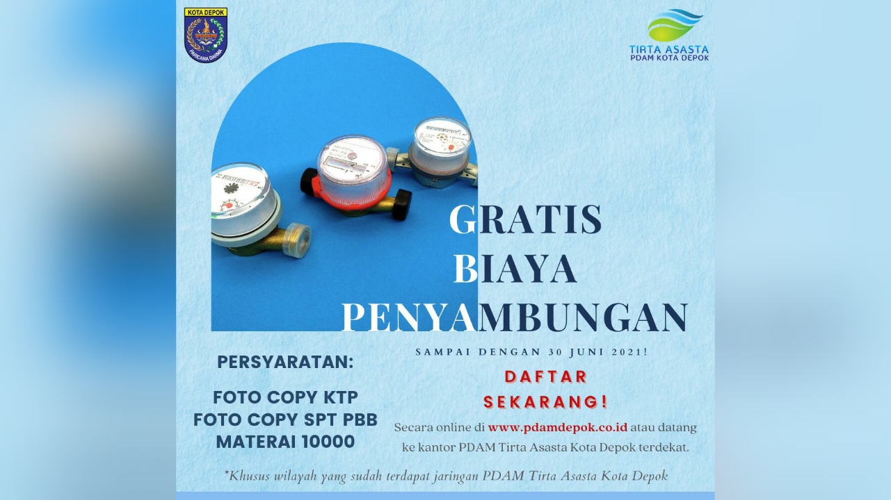 INDONESIAUPDATE.ID – PDAM Tirta Asasta Depok memperluas area jaringan pelayanan dan gratiskan biaya pemasangan baru bagi warga masyarakat kota Depok.