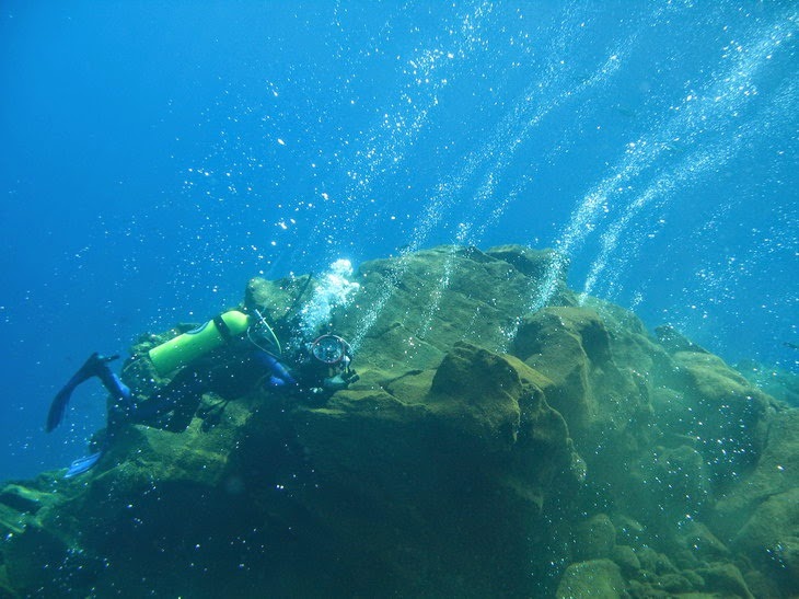 Saat mulai menyelam, kita akan langsung berjumpa dengan gelembung-gelembung udara keluar dari celah bebatuan. Inilah gas yang menyembur dari perut Banua Wuhu dan suhu di sekitarnya cukup hangat, sekitar 38-39 derajat Celcius.