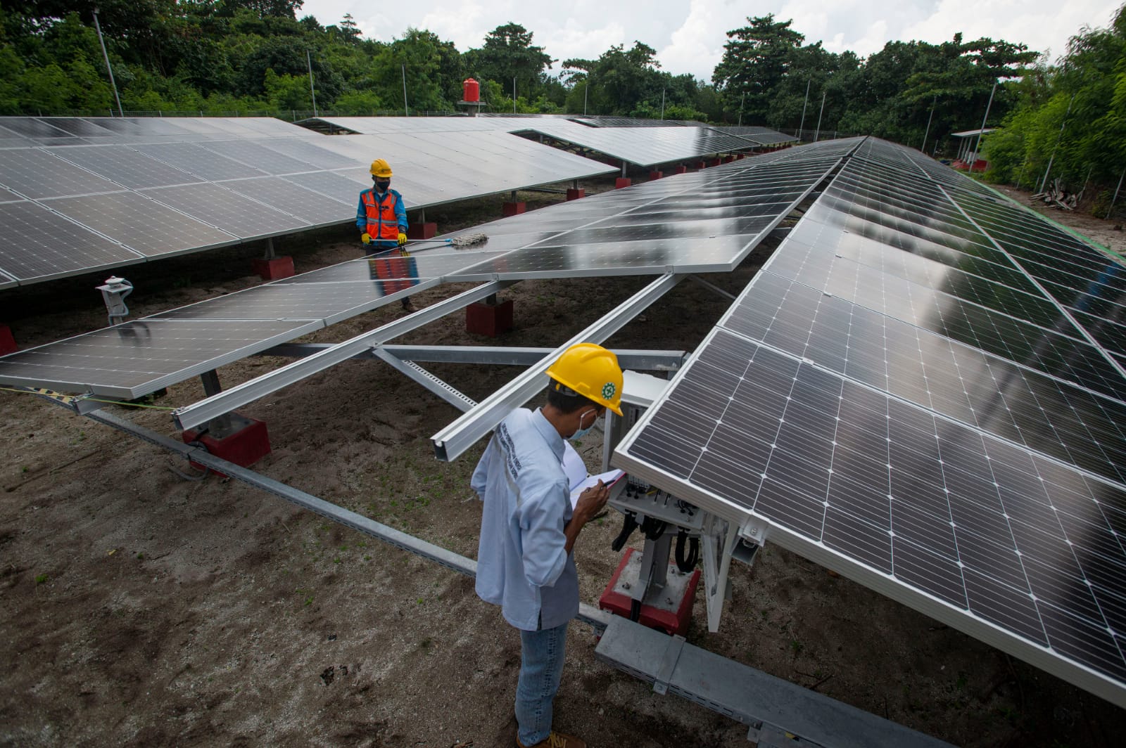Perawatan panel surya di Pembangkit Listrik Tenaga Surya (PLTS) Pulau Sabira, Kabupaten Kepulauan Seribu, DKI Jakarta, Kamis (17/6/2021). PLTS berkapasitas daya sebesar 400 kilo Watt peak (kWp) tersebut dapat menghasilkan energi listrik sebesar 1.200 kWh.(ANTARA FOTO/Aditya Pradana Putra via Indonesia.go.id)