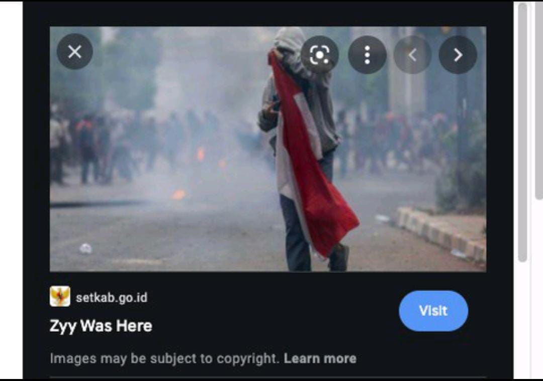 Namun di Google, muncul gambar dari situs Setkab berupa foto Lutfi pembawa bendera. Tampilan situs Setkab disertai tulisan ‘Zyy Was Here’.