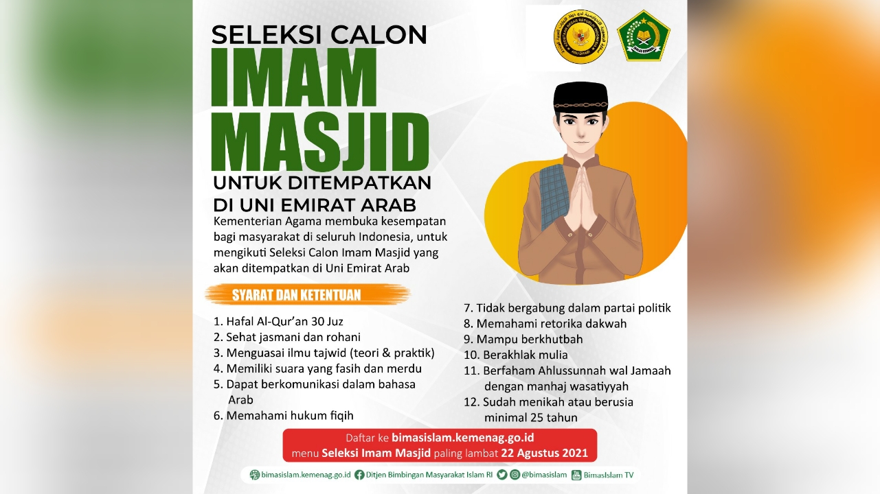 INDONESIAUPDATE.ID – Kementerian Agama kembali membuka seleksi imam masjid asal Indonesia untuk ditempatkan di Uni Emirat Arab. Seleksi akan dilangsungkan secara virtual pada 25-27 Agustus 2021.