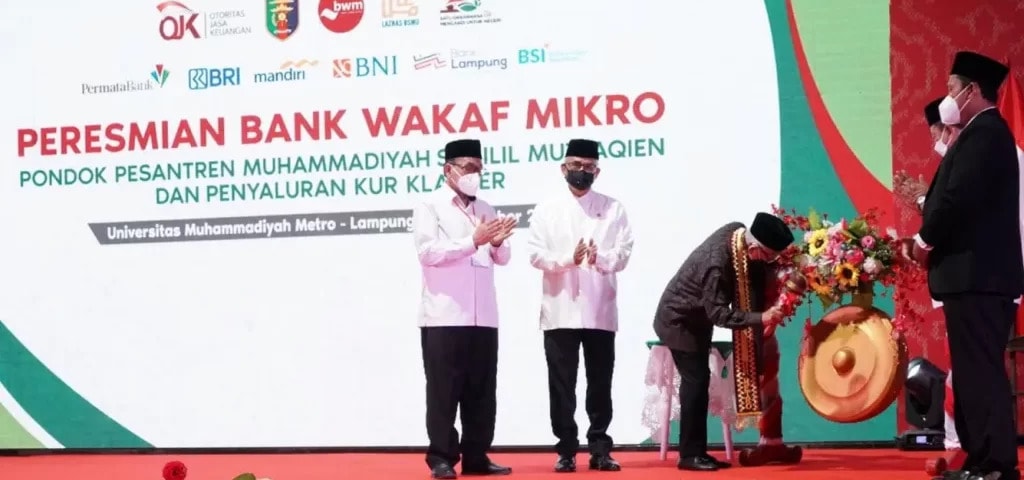 “Bank Wakaf Mikro ini merupakan rintisan menumbuhkan pengusaha-pengusaha kecil yang kita harapkan nantinya menjadi alat pengungkit yang nantinya bisa tumbuh dan bisa menjadi nasabah Bank Syariah Umum,” tutur Wakil Presiden (Wapres) RI, Ma’ruf Amin saat menghadiri Peresmian Program Bank Wakaf Mikro Pondok Pesantren Muhammadiyah Sabilil Muttaqien dan Penyaluran KUR Klaster, di Universitas Muhammadiyah Metro, Lampung, Kamis (23/12/2021).