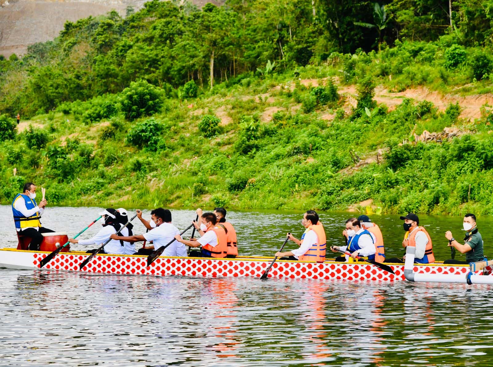 INDONESIAUPDATE.ID – Presiden RI Joko Widodo meresmikan Bendungan Ladongi di Kabupaten Kolaka Timur, Provinsi Sulawesi Tenggara (Sultra), Selasa (28/12/2021) Desember 2021. Berbeda dari biasanya, kali ini Presiden Jokowi menyampaikan pernyataan peresmian sambil menumpangi perahu naga di bendungan tersebut.