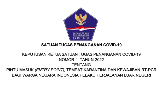 INDONESIAUPDATE.ID – Ketua Satuan Tugas (Satgas) Penanganan COVID-19 Suharyanto menandatangani Surat Keputusan Nomor 1 Tahun 2022 tentang Pintu Masuk (Entry Point), Tempat Karantina, dan Kewajiban RT-PCR bagi Warga Negara Indonesia (WNI) Pelaku Perjalanan Luar Negeri pada tanggal 1 Januari 2022.