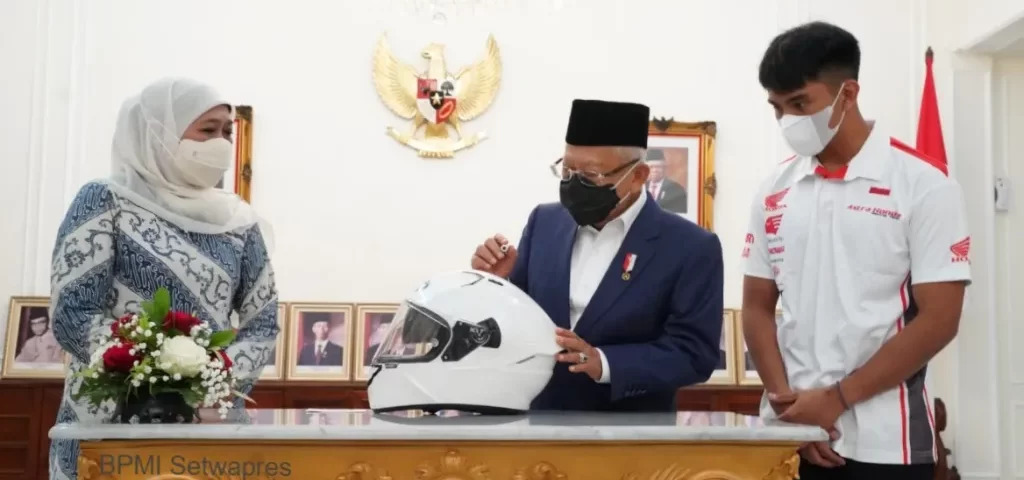 INDONESIAUPDATE.ID – Di akhir pekan ini, Sabtu (22/01/2022), Wakil Presiden (Wapres) RI, Ma’ruf Amin menerima audiensi pembalap muda Mario Suryo Aji, di Jakarta. Kedatangan pembalap kebanggaan Indonesia yang didampingi Gubernur Jawa Timur Khofifah Indar Parawansa ini untuk memohon doa dan dukungan sebelum berlaga pada ajang balap motor dunia Moto3 GP 2022.