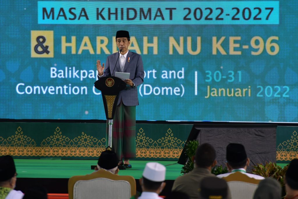“Pertama-tama, atas nama pemerintah dan bangsa Indonesia saya menyampaikan selamat kepada seluruh pengurus PBNU masa khidmat tahun 2022 sampai dengan tahun 2027, di bawah kepemimpinan Rais Am Bapak Kiai Haji Miftachul Akhyar dan Ketua Umum PBNU Bapak Kiai Haji Yahya Cholil Staquf,” kata Presiden Jokowi membuka sambutannya pada Harlah ke-96 NU, Senin (31/01/2022), di Balikpapan Sport and Convention Center, Provinsi Kalimantan Timur.