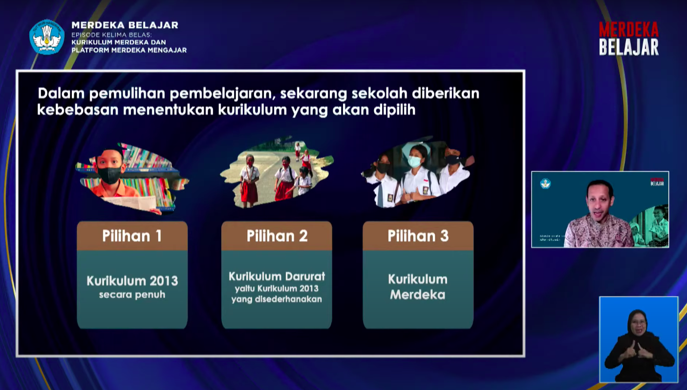 Dalam pemulihan pembelajaran saat ini, lanjut Nadiem, satuan pendidikan diberikan kebebasan menentukan tiga kurikulum yang akan dipilih atau tidak dipaksakan. Pilihan pertama, Kurikulum 2013 secara penuh, pilihan kedua Kurikulum Darurat, yaitu Kurikulum 2013 yang disederhanakan, dan pilihan ketiga adalah Kurikulum Merdeka.