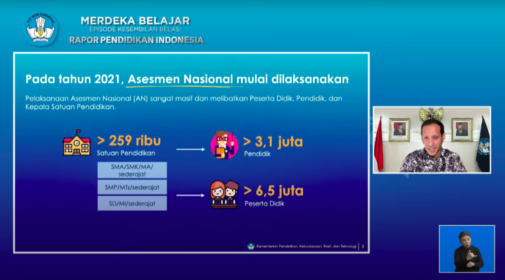 INDONESIAUPDATE.ID – Kementerian Pendidikan, Kebudayaan, Riset, dan Teknologi (Kemendikbudristek) meluncurkan Merdeka Belajar Episode ke-19: Rapor Pendidikan Indonesia. Kemendikbudristek menghadirkan platform Rapor Pendidikan yang berisi laporan hasil Asesmen Nasional (AN) dan analisis data lintas sektor untuk masing-masing satuan pendidikan dan daerah. AN menggantikan Ujian Nasional (UN) dengan penyempurnaan pengukuran aspek kognitif dan non-kognitif serta penggunaan teknologi.