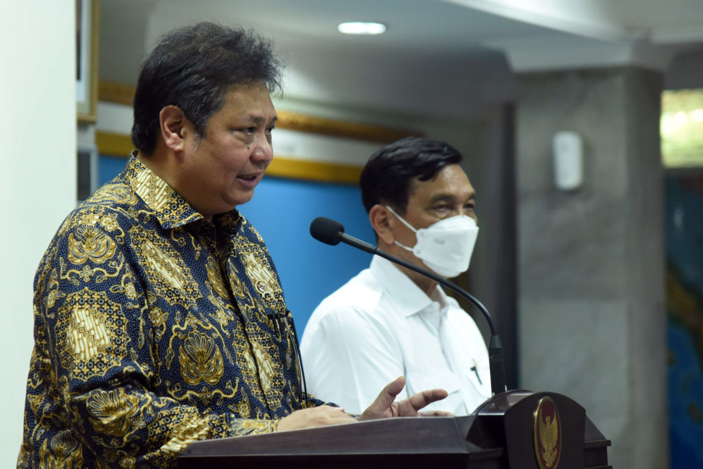 Menko Ekon Airlangga Hartarto dan Menko Marves Luhut Binsar Pandjaitan memberikan keterangan pers usai Ratas PPKM di Istana Merdeka, Jakarta, Senin (04/04/2022). (Foto: Humas Setkab/Rahmat)