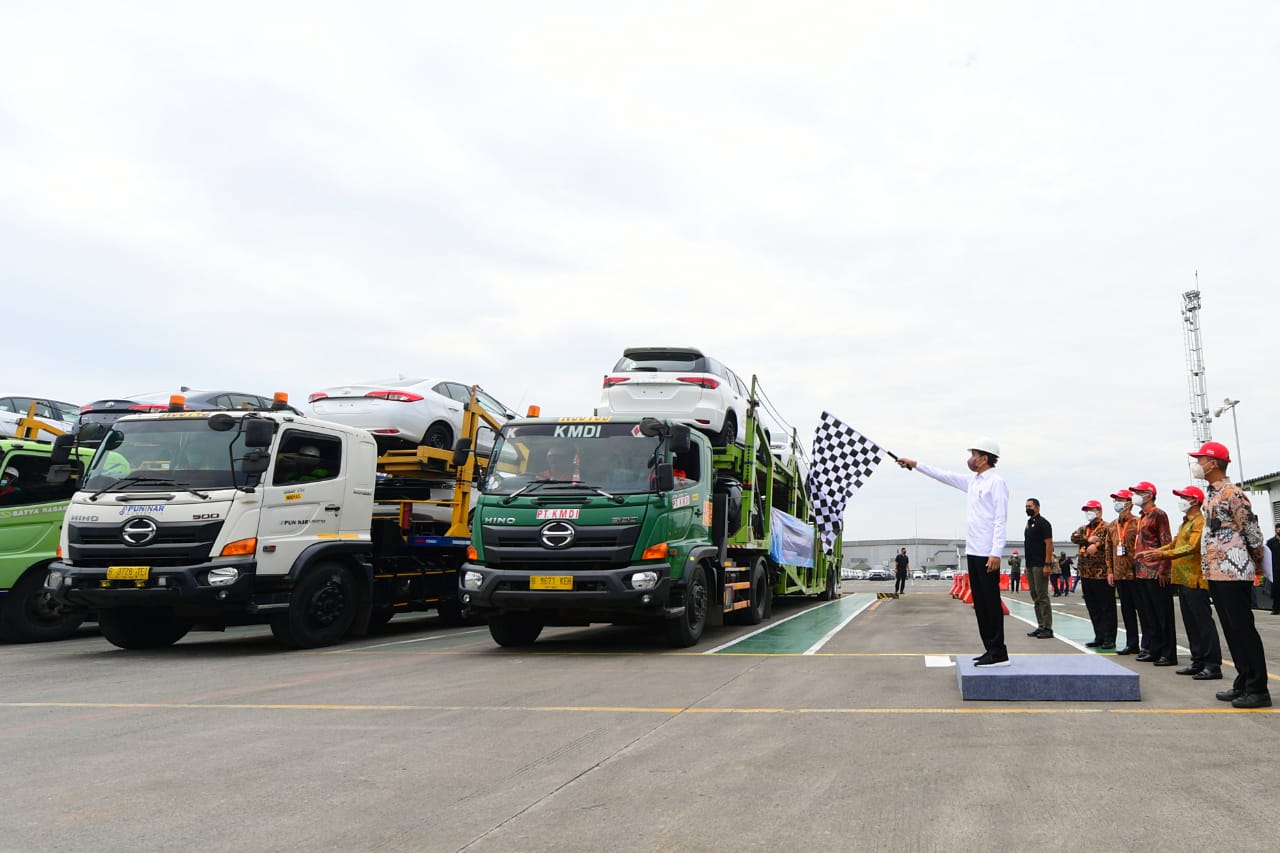 Presiden Jokowi pada pelepasan ekspor Fortuner perdana ke Australia, di Karawang, Jawa Barat, Selasa (15/02/2022). (Foto: Muchlis Jr)