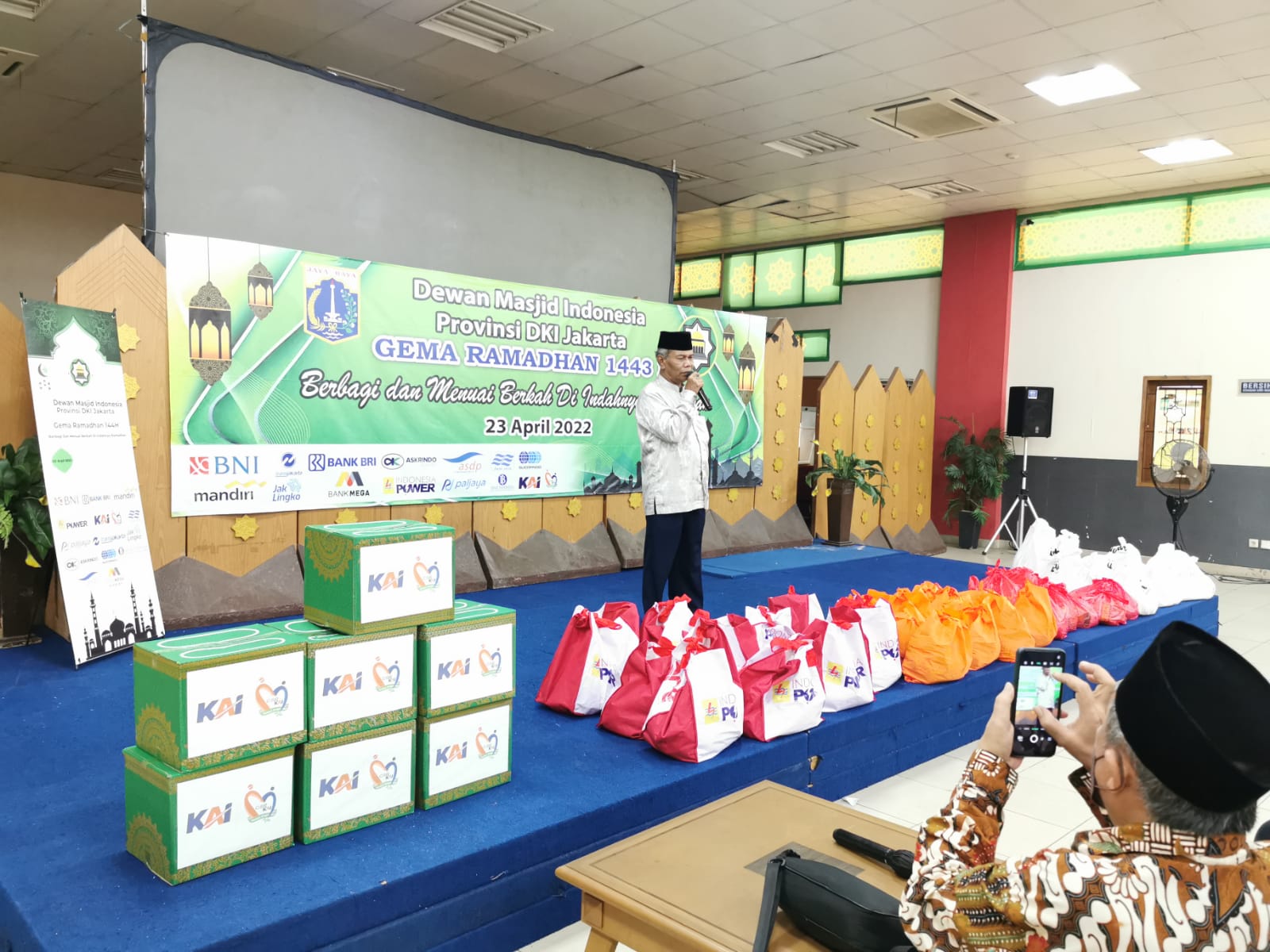 INDONESIAUPDATE.ID – Pengurus Wilayah (PW) Dewan Masjid Indonesia (DMI) Provinsi DKI Jakarta menyelenggarakan kegiatan Pembagian 2000 bantuan bahan pangan bagi Anak Yatim, Dhuafa dan Pengurus Masjid yang ada di Jakarta dengan kerjasama dengan Bank BNI, Mandiri, BRI, Indonesia Power, KAI, Jak Lingko, Palijaya, Sucofindo, Sabtu (23/04/2022) yang dipusatkan di Kantor DMI DKI, Islamic Center Jakarta.