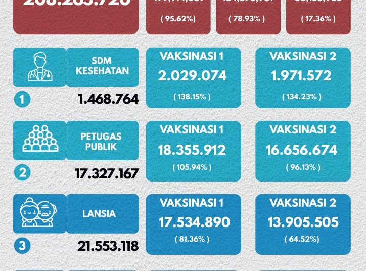 Secara rinci cakupan dosis pertana mencapai 199 juta atau 95,63 persen. Cakupan dosis dua mencapai 164,5 juta (79 persen), dan cakupan vaksin dosis ketiga mencapai 36,8 juta (17,68 persen).
