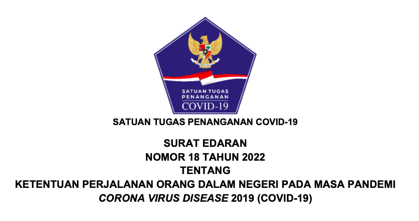 INDONESIAUPDATE.ID – SE Satgas COVID-19 NO18/2022 Satuan Tugas (Satgas) Penanganan COVID-19 menerbitkan Surat Edaran (SE) Nomor 18 Tahun 2022 tentang Ketentuan Perjalanan Orang Dalam Negeri Pada Masa Pandemi Corona Virus Disease 2019 (COVID-19). SE yang ditandatangani Ketua Satgas Suharyanto pada tanggal 18 Mei ini berlaku mulai 18 Mei 2022.