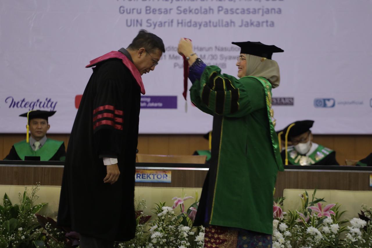 Selaku promotor, Guru Besar Sekolah Pascasarjana UIN Syarif Hidayatullah Prof. Dr. Azyumardi Azra, MA, CBE. Hadir, Rektor UIN Syarif Hidayatullah Prof. Dr. Amany Lubis, Ketua Senat UIN Syarif Hidayatullah Prof Dr Abudin Nata, serta para guru besar dan anggota senat.