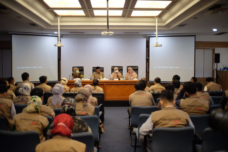 Wakil Wali Kota Depok, Imam Budi Hartono didampingi Kepala Dinas Sosial (Dinsos) Depok, Asloeah Madjri memberikan pengarahan kepada 63 korkel KDS di di aula Bank Jawa Barat (BJB) Kantor Cabang (KC) Depok, Senin (06/06/22). (Foto : JD01/Diskominfo).