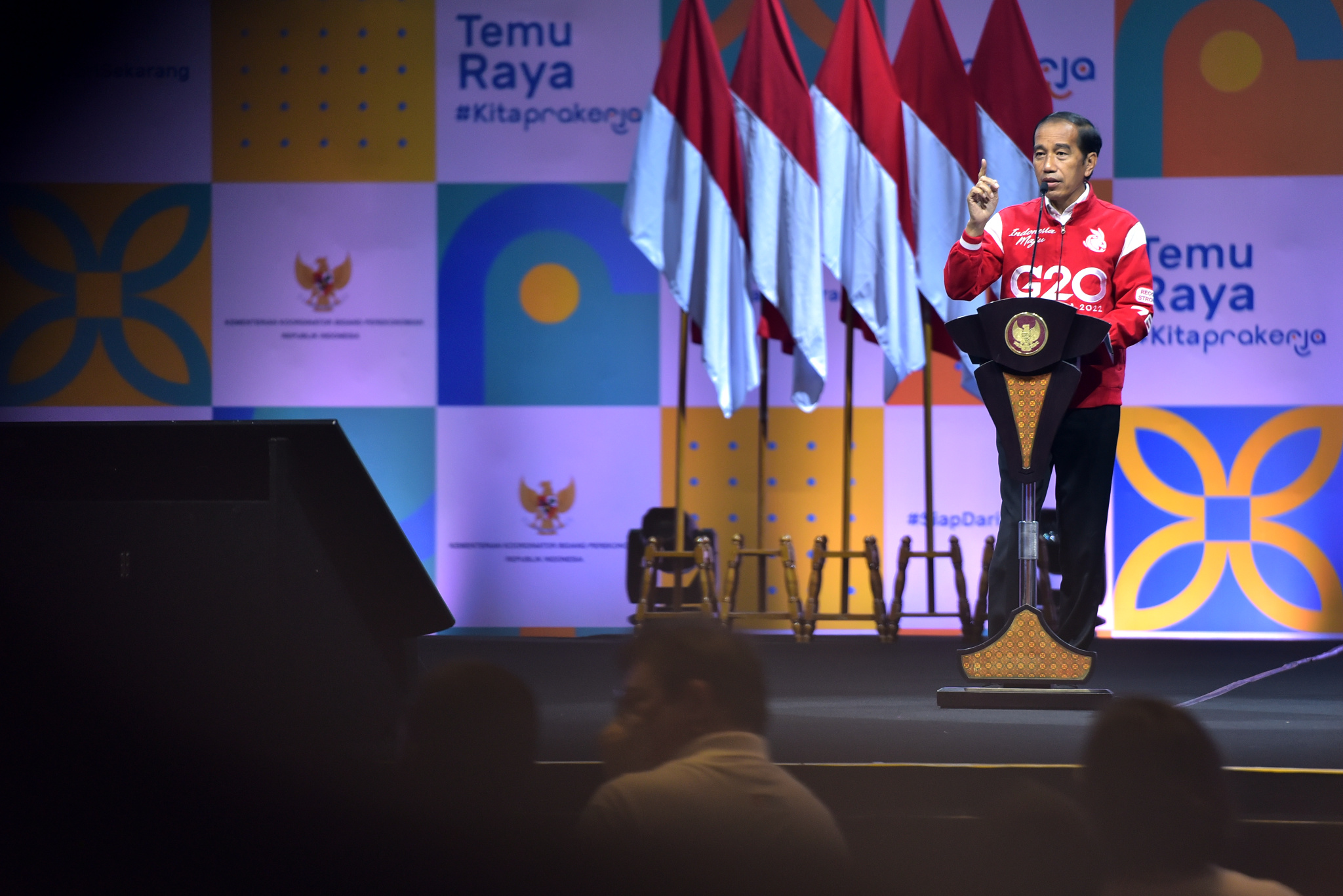 Presiden Jokowi saat menghadiri acara Silaturahmi dengan Alumni Penerima Kartu Prakerja di Sentul International Convention Center (SICC), Kabupaten Bogor, pada Jumat (17/06/2022). (Foto: Humas Setkab/Agung)