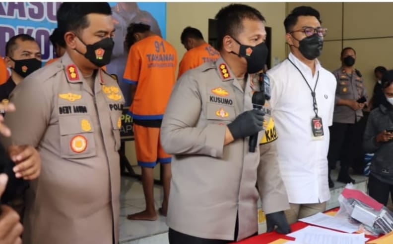 Kapolresta Sidoarjo Kombes Pol. Kusumo Wahyu Bintoro, saat memberikan keterangan penangkapan terduga pengedar narkoba di Balongbendo, Sidoarjo, Rabu (13/7).foto hms