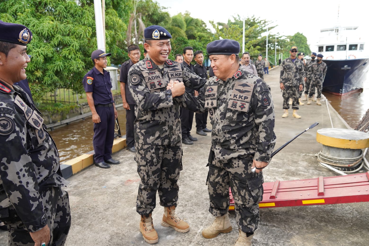 Direktur Jenderal Pengawasan Sumber Daya Kelautan dan Perikanan, Laksamana Muda TNI Adin Nurawaluddin, menyambut dan memberikan gelar penghormatan kepada Nakhoda beserta seluruh awak kapal pengawas Hiu Macan 01 yang memasuki Muara Sungai Kapuas untuk membawa 2 kapal ikan Vietnam ke Stasiun PSDKP Pontianak guna proses hukum lebih lanjut.