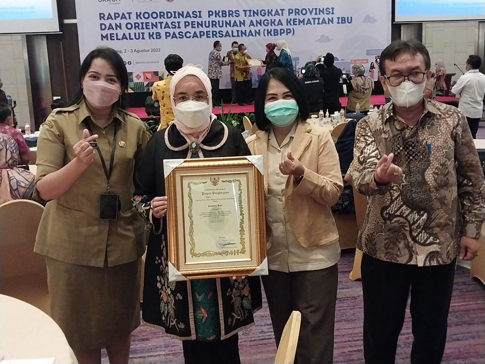 Nurhayati mengatakan, Alhamdulillah berkat kerjasama yang terjalin dan kerja keras semua pihak, hari ini dalam kegiatan Rapat Koordinasi Pelayanan Keluarga Berencana Rumah Sakit (PKBRS) dan orientasi penurunan angka kematian ibu melalui KB Pasca Persalinan (KBPP), Pemkab Bogor melalui DP3AP2KB mendapatkan penghargaan dari Gubernur Jawa Barat dengan kategori Pelayanan Sejuta Akseptor Capaian diatas 100 persen.