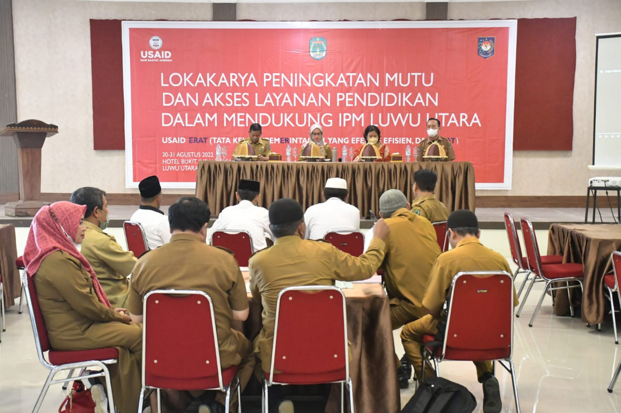 Hal ini Indah katakan saat membuka kegiatan Lokakarya Peningkatan Mutu dan Akses Layanan Pendidikan dalam Mendukung Indeks Pembangunan Manusia (IPM) Kabupaten Luwu Utara di Aula Hotel Bukit Indah, Masamba, Selasa (30/8/2022). Lokakarya ini dilaksanakan oleh Dinas Pendidikan Luwu Utara bekerjasama dengan USAID ERAT.