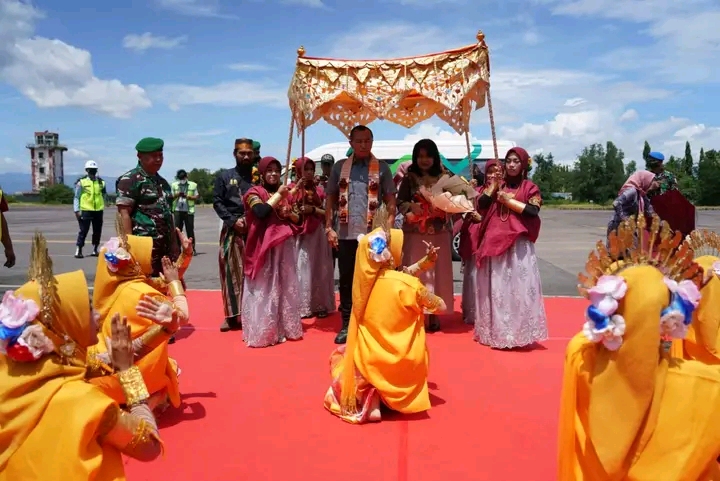 Tepat pukul 12.40 Wita Pangdam XIV/Hasanuddin Mayjen TNI Dr. Totok Imam Santoso, S.I.P., S.Sos., M.Tr (Han) beserta Ketua Persit KCK PD XIV Hasanuddin Ny. Desi Totok Imam tiba di Bandara Sultan Hasanuddin, disambut dengan prosesi pengalungan sarung sutera dan pemberian hand bouquet.