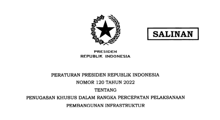 INDONESIAUPDATE.ID – Pemerintah menerbitkan Peraturan Presiden Republik Indonesia (Perpres) Nomor 120 Tahun 2022 tentang Penugasan Khusus dalam rangka Percepatan Pelaksanaan Pembangunan Infrastruktur. Peraturan tersebut ditetapkan oleh Presiden RI Joko Widodo (Jokowi) pada tangga 27 September 2022.