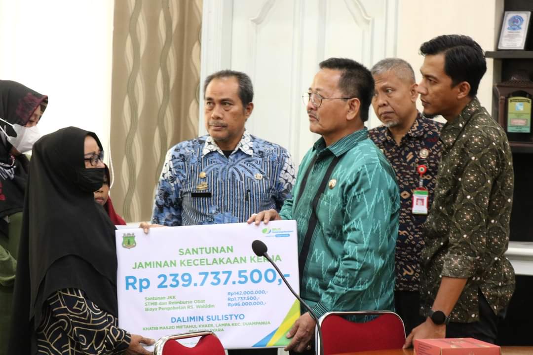 Pada kesempatan ini, diserahkan santunan Jaminan Kematian dan Beasiswa bagi ahli waris Sukriadi, Tenaga Non ASN Sekretariat Daerah kabupaten Pinrang senilai 129 Juta Rupiah dan Ahli Waris Dalimin Sulistyo Khatib Masjid Miftahul Khaer Lampa senilai 239 juta.