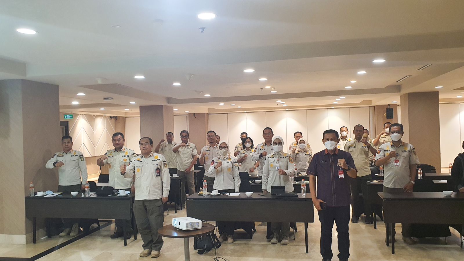 Sekretaris Direktorat Jenderal Bina Administrasi Kewilayahan, Indra Gunawan SE, M.PA., didampingi oleh Plh Direktur Polisi Pamong Praja dan Perlindungan Masyarakat, Edi Samsudin SE, MAP., memberikan pengarahan sekaligus membuka rapat.