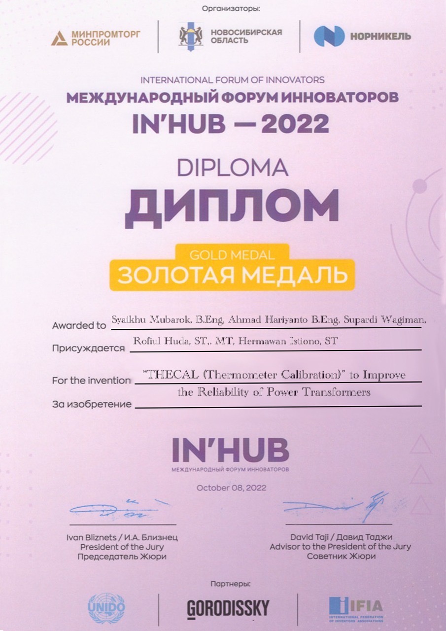 karya inovasi PLN yakni THECAL (Thermometer Calibration) to Improve the Reability of Power Transformers mendapatkan penghargaan di International Forum of Innovator IN’HUB Tahun 2022.