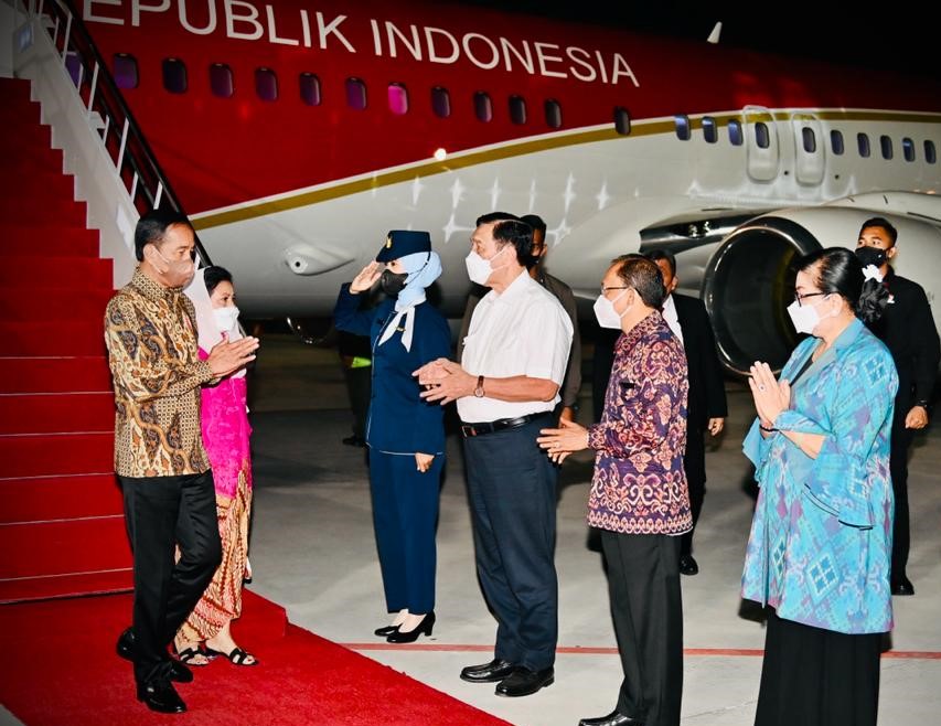 Setibanya di Bandara Internasional I Gusti Ngurah Rai, Kabupaten Badung, Presiden dan Ibu Iriana disambut seperti penyambutan resmi pemimpin negara G20. Turun di tangga pesawat, Presiden disambut pasukan jajar kehormatan dan tarian Bali di area tarmak.