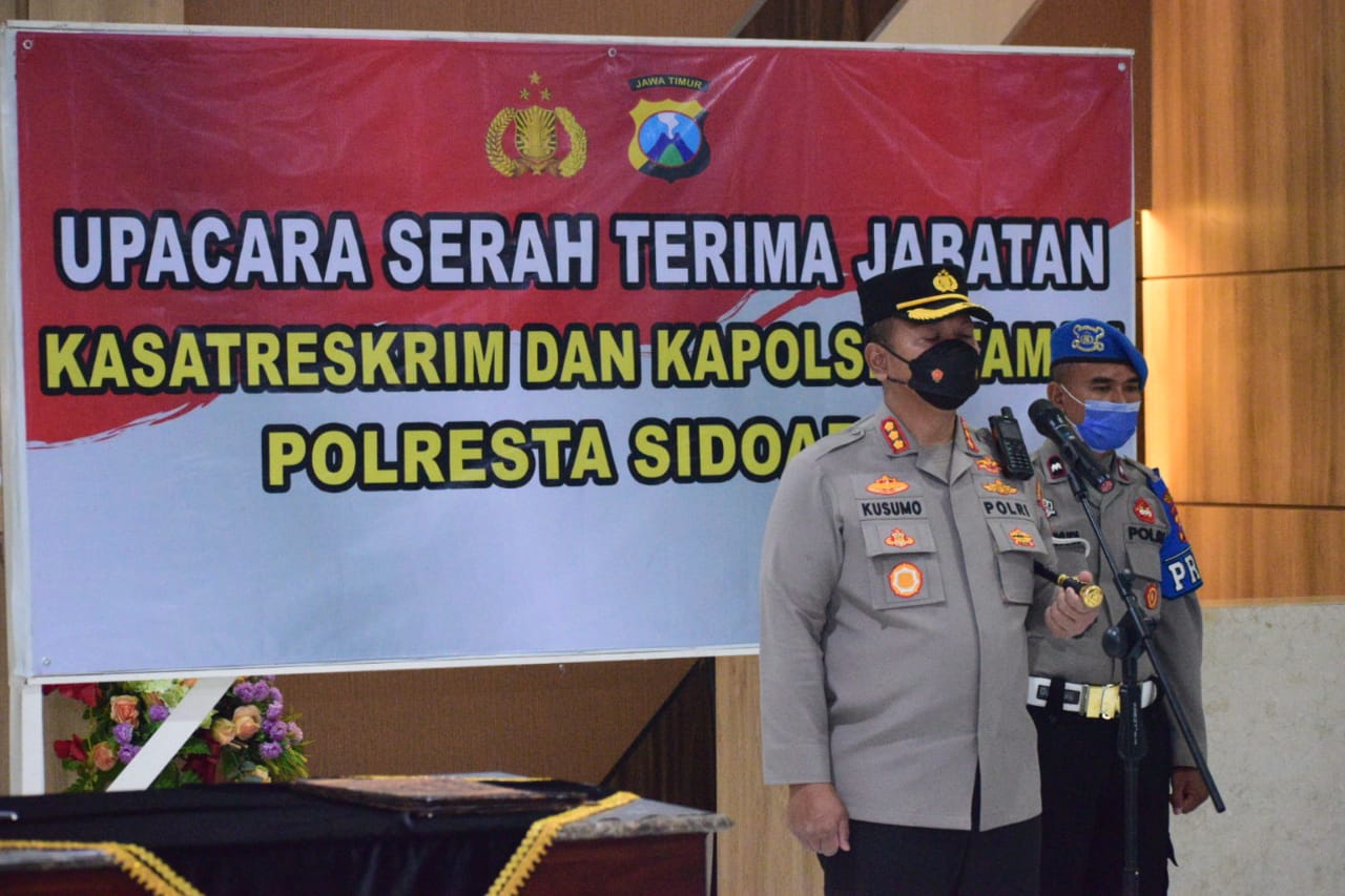 INDONESIAUPDATE.ID – Kapolresta Sidoarjo Komisaris Besar Polisi Kusumo Wahyu Bintoro pimpin serah terima jabatan Kasat Reskrim Polresta Sidoarjo dan Kapolsek Taman bertempat di ruang lobi Mapolresta Sidoarjo,Senin (28/11).