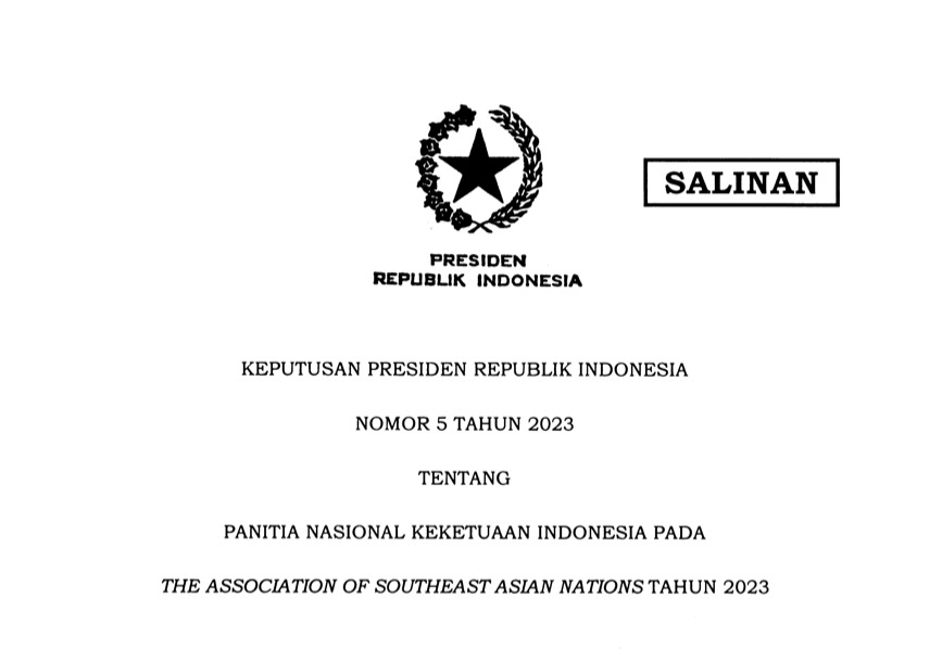 INDONESIAUPDATE.ID – Presiden RI Joko Widodo (Jokowi) menerbitkan Keputusan Presiden Republik Indonesia (Keppres) Nomor 5 Tahun 2023 tentang Panitia Nasional Keketuaan Indonesia pada the Association of Southeast Asian Nations (ASEAN).