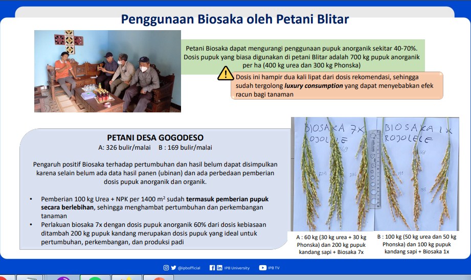 Sebagaimana diketahui, IPB membentuk Tim Kajian Biosaka IPB beranggotakan 10 akademisi yang dipimpin Prof Dr Ir Mitfahudin MSi dari dari hasil kajian lapangan di tiga kabupaten meliputi Karawang, Klaten dan Blitar pada medio Februari dan awal Maret 2023.