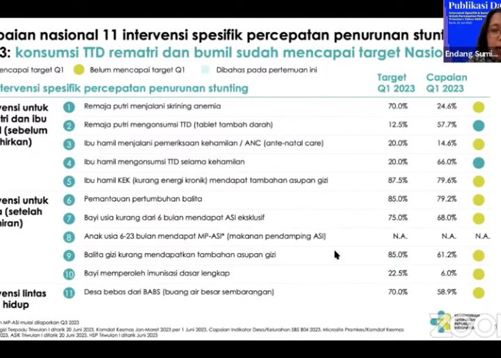 Pada triwulan pertama, dari 11 intervensi spesifik baru 2 intervensi yang pelaksanaannya sudah mencapai bahkan melebihi target, yakni remaja putri mengkonsumsi TTD target nasional triwulan pertama 12,5% dengan capaian 57,7%, dan ibu hamil mengkonsumsi TTD target nasional triwulan pertama 20% dengan capaian 66%.