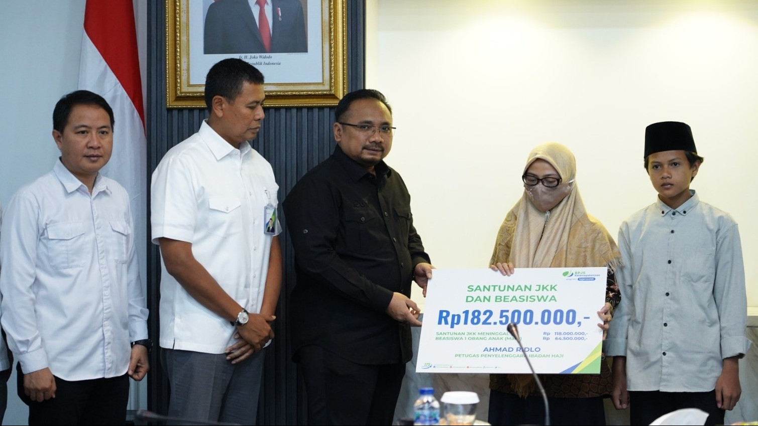 Klaim jaminan sosial dan beasiswa ini diserahkan secara simbolis oleh Menag Yaqut Cholil Qoumas di Kantor Pusat Kementerian Agama, Jakarta. Hadir menyaksikan Direktur Utama BPJS Ketenagakerjaan Anggoro Eko Cahyo, serta Dirjen Penyelenggaraan Haji dan Umrah (PHU) Hilman Latief beserta jajarannya.